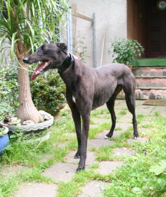 Sellners brachten ihn am Samstag, 5.7.08, 15:30 Uhr, ein selbstbewusster, schwarzer Greybub, der sich sofort zurechtfand, mit der Meute Kontakt aufnahm und nachdem er im Gästezimmer auf dem Bett ein Schläfchen absolviert hatte, eine Schüssel Futter verschlang. Schon eine Stunde später mochte er nicht mehr alleine bleiben. Das Zusammenführen klappte sogar hier im Haus problemlos. Er war völlig fasziniert vom großen Spiegel, in den er immer wieder hineinschaute.