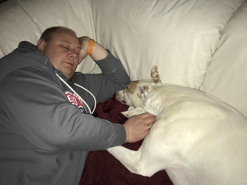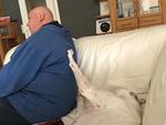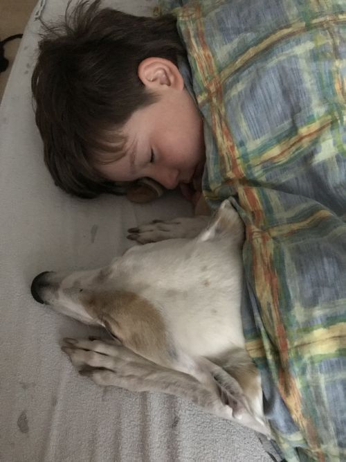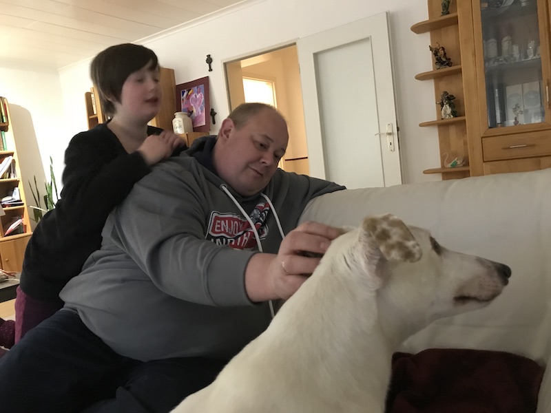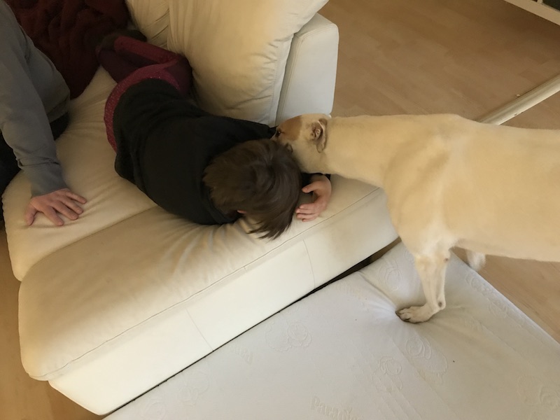 Seit ein paar Wochen hat sich das geändert. Seine Matratze nutzt er selten. Er liegt lieber auf dem Sofa bei uns, mit dem Kopf auf unserem Schoß oder auf dem Arm.