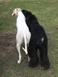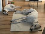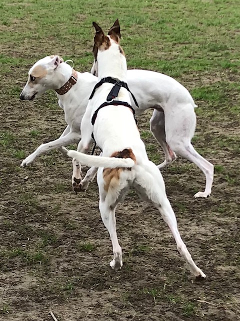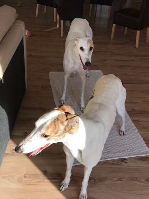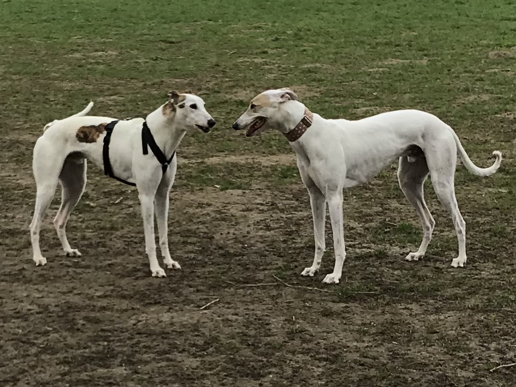 Mein Mann hat sich dort in Barsois verliebt. Er vermisst ja noch einen Hund für sich. Bones ist eher an mich gebunden. Mir wäre ein zweiter Hund noch zuviel und ich denke für Bones wäre es auch noch zu früh und der Zweithund müsste deutlich jünger sein als Bones. Der würde ihm dann sicher auch den ganzen Blödsinn beibringen der bei Greyhounds so üblich ist. Außerdem ist die Möglichkeit mit meiner Schwägerin die Hunde gegenseitig zu betreuen mit 2 Hunden nicht mehr praktikabel. Zufällig haben wir festgestellt, dass die beiden den gleichen Vater haben.