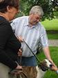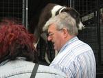 John holt jeden Hund selbst aus der Box und gibt sie den entsprechenden Leuten in die Hand, ich bekomme eine schwarz/weiße Hündin in die Hand gedrückt und lasse sie erst mal auf der Wiese pieseln, sie scheint lustig zu sein und hüpft sogar ein wenig umher.