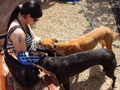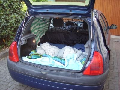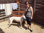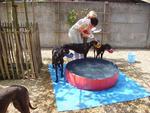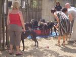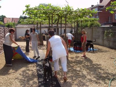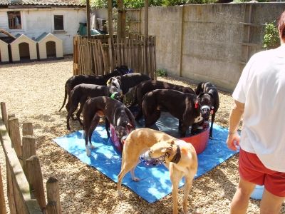 Am "Pfingst"samstag machten wir uns auf um in Antwerpen zwei neue Greyhündinnen vom John abzuholen. Da am Vortag unser Kombi grad spontan meinte er müsse lieber in die Werkstatt als uns zu fahren mussten wir mit dem kleinen Clio fahren. Also blieb Joey zu Hause und alle Fenster wurden abgehängt. Nach der Hinfahrt erwarteten uns in Antwerpen bereits die Greys, da John ein paar Minuten früher da war. Zuerst viel uns der neue Transporter vom John auf, gesponsert von einer Wettfirma (wahrscheinlich ein schlechtes Gewissen) und in diesem saßen unsere beiden schwarzen Schönen. Die beiden schnappten wir uns auch gleich und gingen mit in den Garten von Josephine. Dort waren auch alle anderen Greys und vergnügten sich in den aufgestellen Planschbecken, bei 30 Grad. Zwar hatten alle noch ihren Maulkorb auf, jedoch war Einer lieber als der Andere, und liessen sich gleich streicheln. Nach kurzer Zeit machten wir uns dann auf dem Rückweg, im heissen Auto... Mit zwei hechelnden Hunden und der Sorge um die beiden. Aber mit mehreren Zwischenstops klappte alles und wir brachten die beiden heile nach Hause!