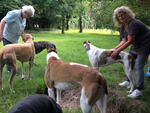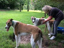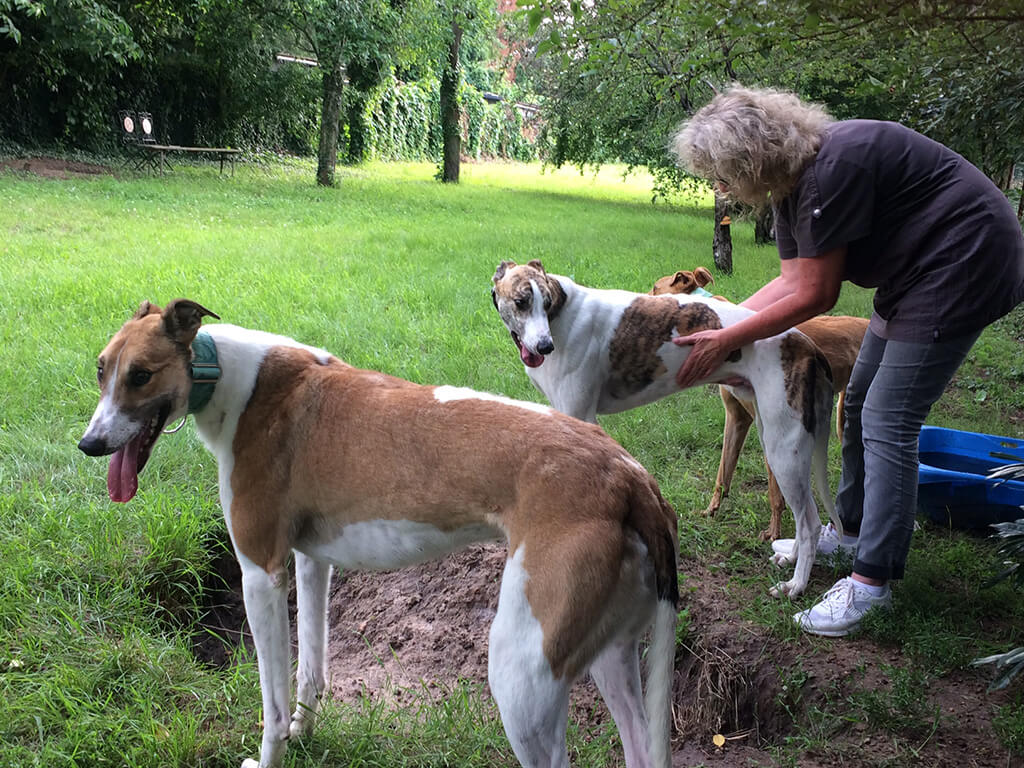 Endlich nach vielen Wochen durften wir wieder vier Iren, die uns Brigid sehr ans Herz gelegt hat, in Empfang nehmen. Dominic, Ian hat Sommerpause, übergab uns unsere Schützlinge wohlbehalten. Wie immer etwas stressig, was aber eher an den total überfüllten Strassen lag und der damit verbundenen Zeit, beim Kaffee und den um uns herumwuselnden Greyhounds danach allerdings in unbändiges Glücksgefühl umschlug. Nette Menschen, tolle Hunde, Kaffe und Süßes, was braucht man mehr. Danke Sabine, Martina, Rosie für Eure Hilfe.