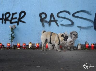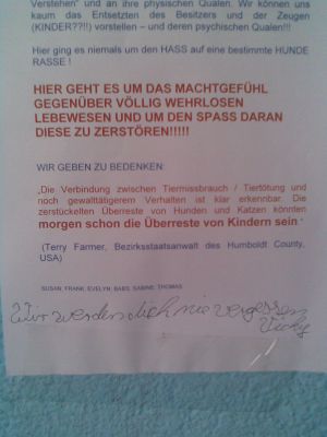 Manch eine Träne wurde vergossen, gerade als Vickys Photos und ihre Geschichte an der Wand plakatiert wurden - nachzulesen bei den Kampfschmusern-. Bleibt noch anzumerken, daß von überall, Bad Kreuznach, Ludwigsburg, Worms....und natürlich aus den umliegenden Gemeinden wirklich viele, viele Hundefreunde kamen, sicher aus den selben Gründen wie wir. In solchen Zeiten müssen wir Hundefreunde etwas näher zusammenrücken.