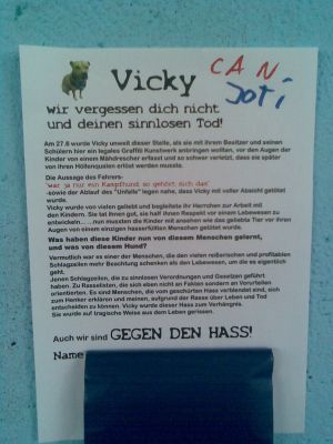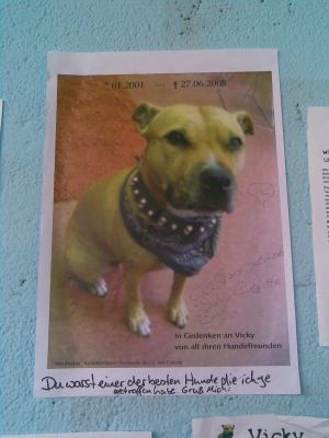 Am Donnerstag, den 3. Juli 2008 trafen sich Hundefreunde in Mannheim zu einer Gedenkfeier, bzw. Mahnwache für die American Stafford Hündin Vicky, die eine Woche vorher von einem Fahrer eines Mähfahrzeuges in voller Absicht überfahren wurde.