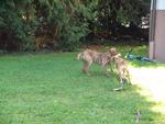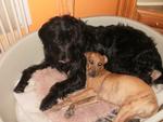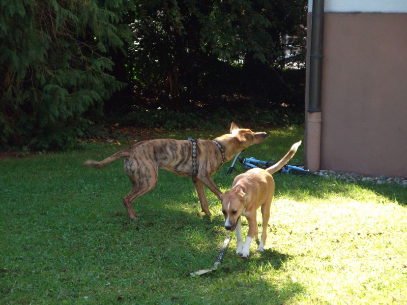 ich wollte mich jetzt dann doch mal nach den ersten Wochen im neuen zu Hause melden, natürlich auch mit ein paar Bildern. Es sind jetzt fast genau 2 Monate, die ich hier verbracht habe und ich sag euch hier gehts rund.....Also als erstes muss ich euch mal meine kleine Familie vorstellen, dass sind einmal die 2 Kater (Tiger und Garfie). Die waren vor mir schon da und ich muss sagen, am Anfang waren mir die 2 nicht wirklich geheuer, aber man gewöhnt sich auch an Katzen und seit 4 Wochen habe ich sogar noch eine neue Kumpeline an meiner Seite. Wir haben uns auf Anhieb blendend verstanden und nach 2minütigem Bellen sind wir uns abwechselnd in der Wohnung hinterher gelaufen. Die Freche hat mir nämlich mein "Streifenhörnchen" geklaut und das wollte ich natürlich selbst haben. Und ich sag euch was, ganz im Vertrauen! Ich bin ganz schön froh das die Kleine da ist. Wenn ich manchmal Angst habe, dann nimmt sie das einfach in die Hand und "diskutiert" das mit den entsprechenden Empfängern aus. Und ich warte dann oder belle einfach mit, um dem ganzen ein bisschen männlichen Zuspruch zu geben. Seit wir hier wohnen weiß auch jeder Bescheid was hier so los ist....Unser Grundstück ist gefälligst nur von außen zu betrachten und wer rein will muss erst an der Grace vorbei! Die macht die Schnupper-Sprung-Attacke und wer standfest und streichelwillig ist, der darf rein! Die Frau Schenzinger hat uns am Wochenende auch mal wieder besucht und die durfte dann natürlich auch rein. Am Anfang hab ich die 3 (sie hat sich gleich Verstärkung mitgebracht) nicht erkannt und musste erstmal ein bissle Bellen und weglaufen. Aber nach einer gewissen Zeit hab ich mich dann doch mal getraut und bin nicht gleich weg gelaufen wenn jemand auf mich zu kam. Alles in allem fand die Frau Schenzinger wohl das es mir hier ganz gut geht und hat mich nicht wieder eingepackt.....puhhhhhh.....da is mir am Anfang ja die Muffe gegangen, aber ich darf mein Sofaplätzchen behalten. Gewachsen bin ich auch ganz schön (sagt zumindest Frau Schenzinger) ich selbst würde sagen, vielleicht ein paar klitze kleine Zentimeter, aber bestimmt nicht viel. Hmm was gibt es denn noch so schönes zu berichten????!!! Ach ja, ich hab ja Frauchen und Herrchen ganz vergessen.....Die halten wir fein auf Trab, aber wir gönnen Ihnen natürlich auch immer mal wieder kleine Pausen in denen wir unsere Nickerchen halten. Abends wenn die Katzen draußen sind, gehen wir auch alle zusammen ins Schlafzimmer und kuscheln uns ein. Frauchen im Bett und wir ums Bett herum, Grace bekommt meistens das Plätzchen an frauchens Seite ab. Aber die muss sie ja auch püncktlich morgens wecken, also überlass ich Ihr den Platz auch meistens. So, ich glaube sonst gibt es nicht mehr viel zu berichten, die üblichen Verluste wie Schuhe, Kissen und das halbe Sofa haben unsre 2-beiner heroisch hingenommen. Sie räumen jetzt immer alles außer Reichweite, das finden wir doof, das sind doch alles viel tollere Spielsachen als die blöden Stoff- und Kauknochen, oder unser Streifenhörnchen.